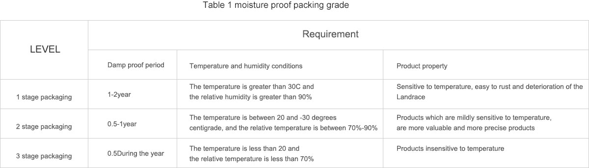 The packaging of moisture should be graded according to general performance factors such as the nature of the product, circulation environment, storage time and packing container to determine the moisture proof package is divided into 1 grades, grade 2, 3 packaging packaging packaging, see table 1.