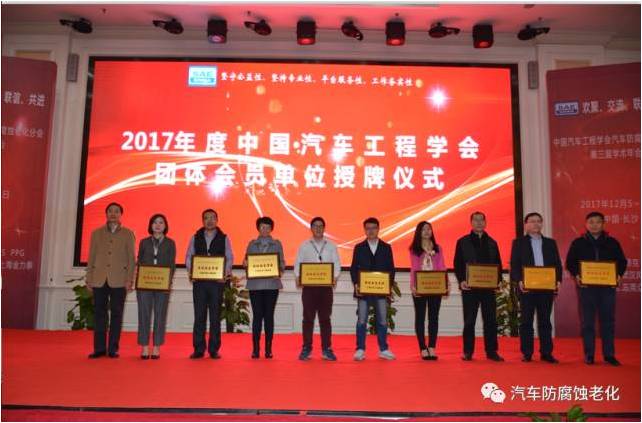 接下來是頒發(fā)2017年度中國汽車工程學會團體會員單位牌匾。今年共有35家單位成為中國汽車工程學會汽車防腐蝕老化分會會員單位,我們分會也成為了中國汽車工程學會旗下會員單位和會員人數(shù)最多的分會。