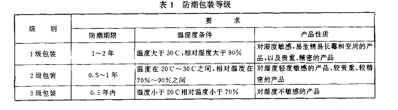 ①包裝的防潮等級應(yīng)根據(jù)產(chǎn)品的性質(zhì)、流通環(huán)境、儲運(yùn)時間、包裝容器的一般性能等因素來確定防潮包裝等級分為1級包裝、2級包裝、3級包裝,詳見表1。